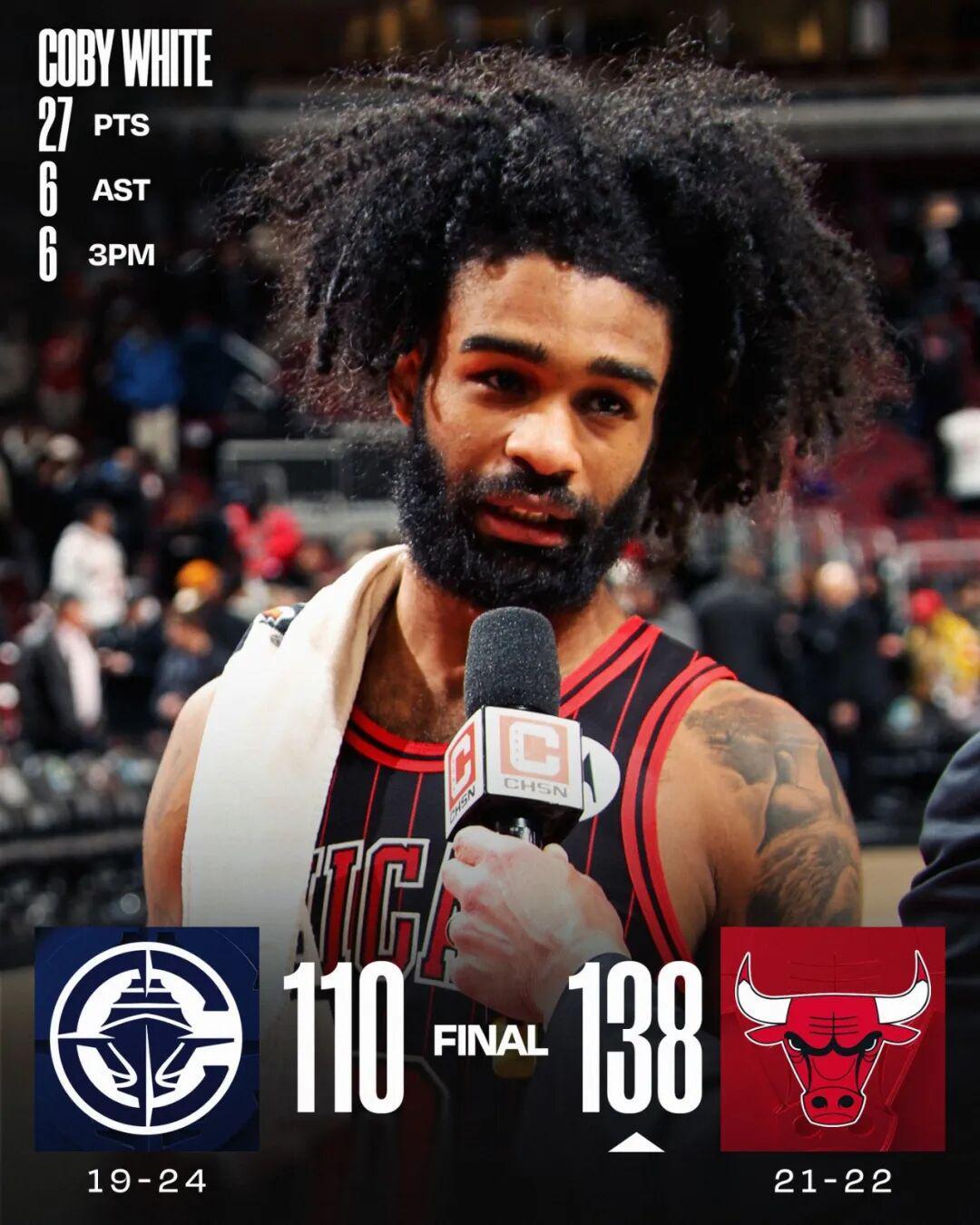 值得一提的是,就在上一场比赛,公牛还坐镇主场138-110终结了快船的六连胜,那场比赛怀特的表现也是非常出色:全场出战30分钟,投篮16中9,三分10中6,罚球3中3,拿下27分2篮板6助攻,正负值+15。